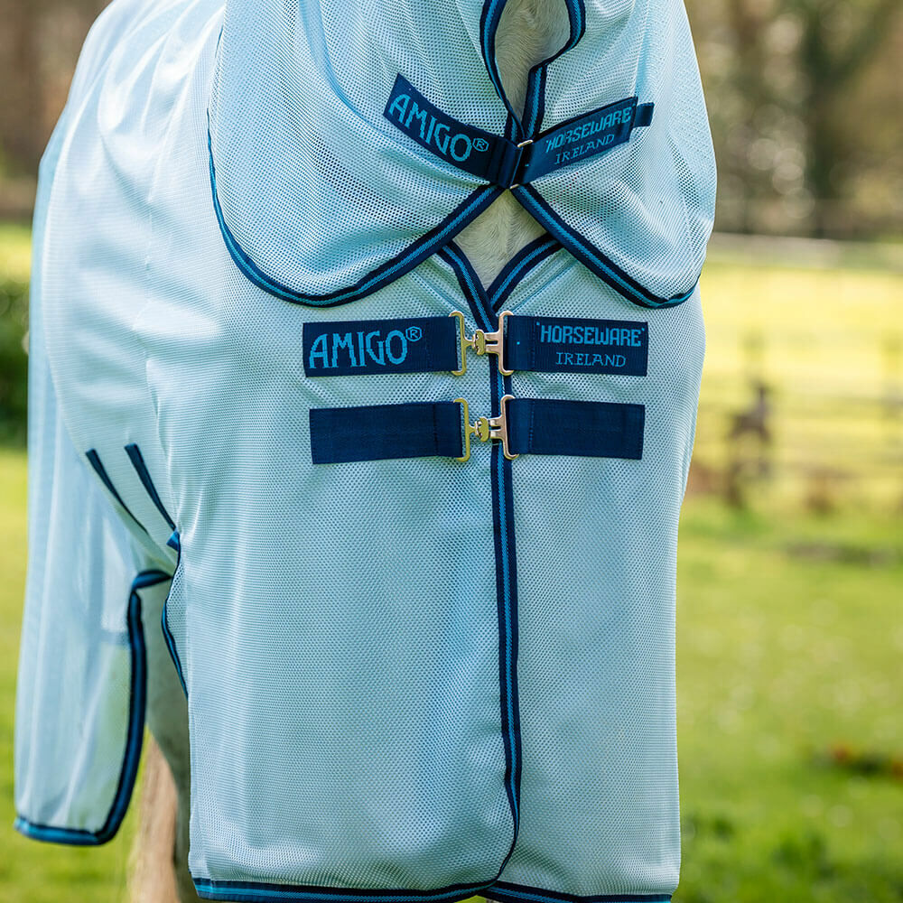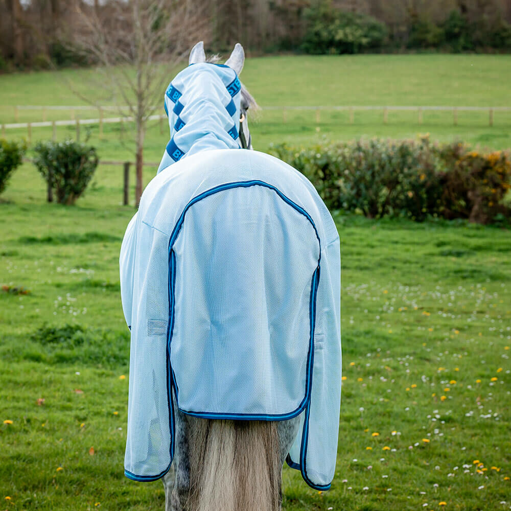 Cut from a strong, lightweight mesh Polyester, this fly sheet offers 65% UV protection. Featuring a supersized tail flap with a silky lining. The extra-wide belly flap gives exceptional belly coverage underneath three straight surcingles, with Velcro to secure the overlap.
